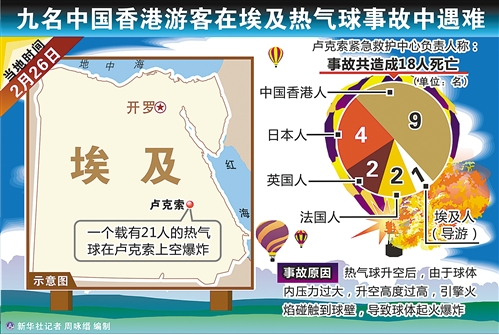 2月26日,在盧克索附近,救援人員在發(fā)生熱氣球爆炸的事故現(xiàn)場查看熱氣球殘骸。