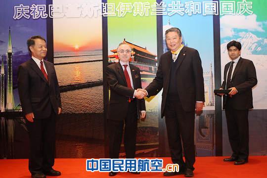 3月21日,在巴基斯坦國(guó)慶日來臨之際,巴基斯坦駐中國(guó)大使館在北京舉辦巴基斯坦國(guó)慶日招待會(huì)。巴基斯坦駐華大使馬蘇德哈立德代表巴基斯坦總統(tǒng)向7位為增進(jìn)巴中關(guān)系而做出重要貢獻(xiàn)的中國(guó)公民授予獎(jiǎng)?wù)隆F渲,中航工業(yè)董事長(zhǎng)林左鳴被授予巴基斯坦“卓越之星”國(guó)家榮譽(yù)獎(jiǎng)?wù)拢员碚昧肿篪Q董事長(zhǎng)為推動(dòng)中巴兩 國(guó)航空合作、推進(jìn)巴基斯坦航空事業(yè)做出的貢獻(xiàn)。