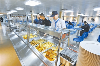 適應(yīng)航母全時工作理念,航母餐廳在正餐基礎(chǔ)上設(shè)置了間餐,提供糕點(diǎn)、水果飲料等,保證了艦員隨時能吃到可口的食品。