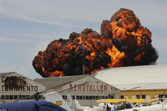 事故發(fā)生在西班牙首都馬德里西南方的Cuatro Vientos 機場,當時約有3000名觀眾觀看在那里舉行的航展。當失事飛機撞上電線并引發(fā)爆炸、噴射出巨大火球時,很多觀眾都被驚得目瞪口呆,其中一名觀眾拍攝下了事故當時的畫面。