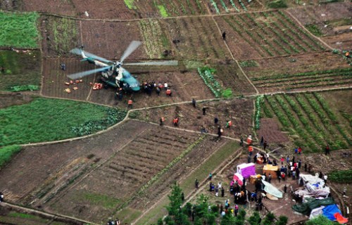 成都軍區(qū)空軍出動直升機對寶盛鄉(xiāng)進行大規(guī)?者\空投(曹憶楠 攝)