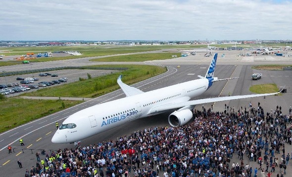 5月13日,在法國(guó)圖盧茲,空中客車(chē)公司(空客)員工慶賀首架空客A350XWB寬體飛機(jī)完成整體涂裝。