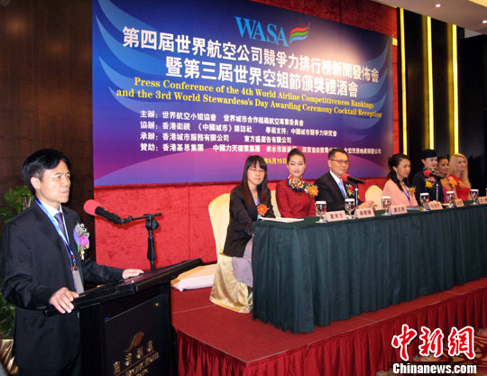 5月15日,由世界航空小姐協(xié)會(huì)等主辦的“第四屆世界航空公司競(jìng)爭(zhēng)力排行榜新聞發(fā)布會(huì)暨第三屆世界空姐節(jié)頒獎(jiǎng)禮酒會(huì)”在香港舉行。中新社發(fā) 任海霞 攝