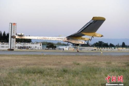 當(dāng)?shù)貢r(shí)間5月3日清晨6時(shí)12分,美國(guó)宇航局位于加州山景城莫菲特機(jī)場(chǎng),瑞士太陽(yáng)能飛機(jī)“太陽(yáng)能驅(qū)動(dòng)”號(hào)起飛,開(kāi)始?xì)v史性的飛越美國(guó)大陸之旅!z影:陳鋼