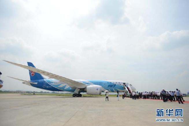 6月2日,南方航空公司在廣州白云機(jī)場(chǎng)舉辦接機(jī)儀式,宣布中國引進(jìn)的首架波音787夢(mèng)想飛機(jī)正式啟動(dòng)運(yùn)營(yíng)。當(dāng)日,我國引進(jìn)的首架波音787夢(mèng)想飛機(jī)飛抵廣州。 新華社記者 王建華 攝