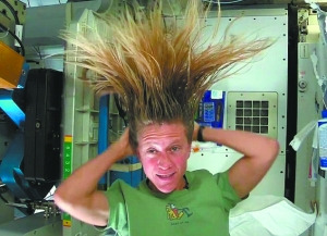卡倫擁有一頭過肩長(zhǎng)發(fā),在太空里這些頭發(fā)全都豎了起來,顯得“怒發(fā)沖冠”。在國(guó)際空間站里,水不會(huì)像地球上那樣從高往低流,而是會(huì)變成無(wú)數(shù)小水珠到處亂飄。