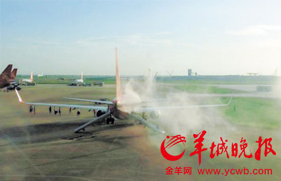 飛機(jī)尾部冒出濃煙,應(yīng)急滑梯全部放下,乘客被疏散到停機(jī)坪