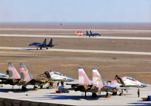 解放軍廣空部隊粉色涂裝蘇-30MKK假想敵戰(zhàn)機部隊在西北基地與殲11戰(zhàn)機對抗訓(xùn)練照曝光。