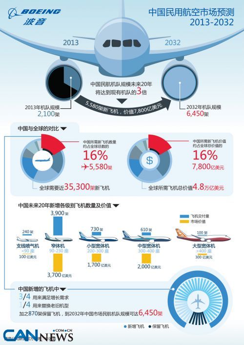 中國市場領先的飛機制造商波音公司預測,未來20年,中國將需要5580架新飛機,總價值達7800億美元。波音今天在北京發(fā)布了2013年中國市場展望,預測到2032年中國民航機隊的規(guī)模將達到現(xiàn)有機隊的三倍。
