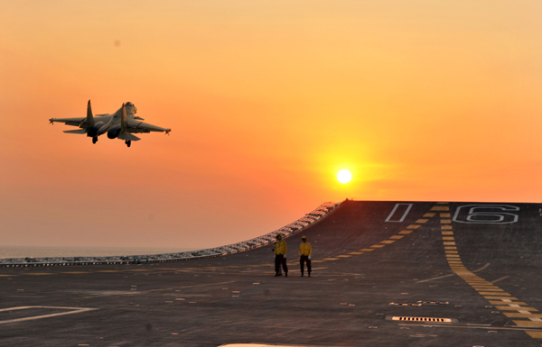 9月15日,殲—15艦載戰(zhàn)斗機成功完成最大重量起降試驗。圖為觸艦復飛的殲—15艦載戰(zhàn)斗機! 垊P攝