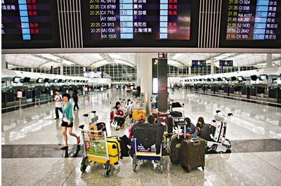 香港機場更陷入癱瘓狀態(tài),截至22日晚9時,共有370班客機取消,76班客機延誤。雖然國泰及港龍航空早在30小時前,于臺風到達香港范圍前一日,已宣布取消22日下午6時后所有航班,但在機場離境大堂內(nèi)仍有大量旅客等候辦理候補機位,希望盡快離港。