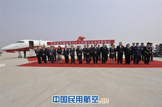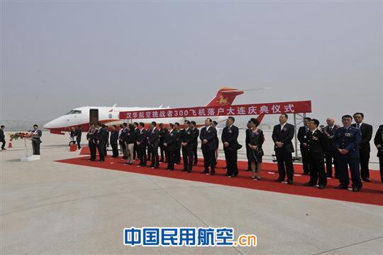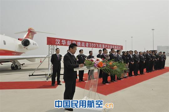 上圖為:漢華航空首架挑戰(zhàn)者300飛機(jī)落戶大連儀式現(xiàn)場(chǎng)
