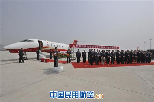 在歡迎儀式上,漢華公務(wù)機(jī)航空有限公司總裁楊建新、大連國(guó)際機(jī)場(chǎng)集團(tuán)有限公司副總經(jīng)理杜志淵、大連港口口岸局局長(zhǎng)高連分別致辭。楊建新總裁對(duì)各位來(lái)賓的光臨表示了熱烈的歡迎和衷心的感謝,漢華公務(wù)機(jī)航空有限公司首架挑戰(zhàn)者300型飛機(jī)的成功引進(jìn)并正式落戶大連,得到了民航東北地區(qū)管理局、大連市人民政府以及大連國(guó)際機(jī)場(chǎng)和其他各有關(guān)方面的大力支持協(xié)助,首架飛機(jī)的入列,標(biāo)志著漢華公務(wù)機(jī)航空有限公司進(jìn)入了新的發(fā)展階段,飛機(jī)投入運(yùn)營(yíng)后,公司將始終不渝地堅(jiān)持“安全第一,預(yù)防為主,綜合治理”的指導(dǎo)思想,堅(jiān)持高起點(diǎn)、高標(biāo)準(zhǔn)、嚴(yán)要求,確保飛行安全,努力將漢華航空打造成中國(guó)一流公務(wù)機(jī)航空服務(wù)品牌。大連市港口口岸局局長(zhǎng)高連在致辭中對(duì)漢華航空首架飛機(jī)的成功引進(jìn)表示熱烈的祝賀,對(duì)楊建新總裁為首的接機(jī)人員表示親切慰問,衷心希望漢華航空以此為起點(diǎn),不斷加強(qiáng)企業(yè)管理,苦練內(nèi)功,努力創(chuàng)造新的輝煌,將漢華航空打造成為大連市的一張靚麗的名片,為促進(jìn)東北亞航運(yùn)中心建設(shè)和帶動(dòng)其他產(chǎn)業(yè)發(fā)展作出應(yīng)有的貢獻(xiàn)。大連國(guó)際機(jī)場(chǎng)集團(tuán)有限公司副總經(jīng)理杜志淵在致辭中指出,漢華航空引進(jìn)的首架挑戰(zhàn)者300型飛機(jī)也是首架正式落戶大連的公務(wù)機(jī),是大連國(guó)際機(jī)場(chǎng)的一件大事,機(jī)場(chǎng)方面將不斷完善公務(wù)機(jī)運(yùn)行服務(wù)保障工作,為航空公司的安全運(yùn)營(yíng)積極創(chuàng)造有利的環(huán)境和條件。