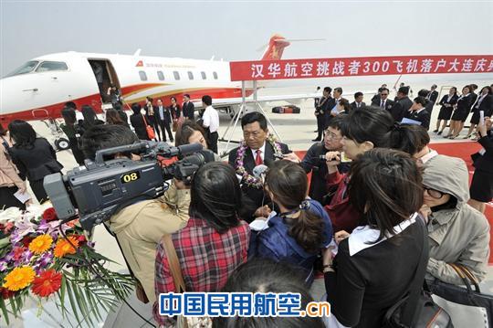 上圖為:漢華航空首架挑戰(zhàn)者300飛機(jī)落戶大連儀式現(xiàn)場(chǎng)
