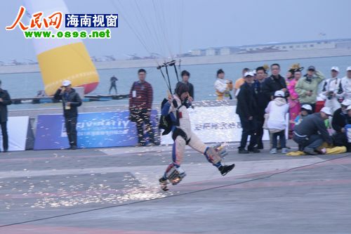 17日上午,2011環(huán)海南飛行拉力賽在?谂e行了隆重的開幕儀式。直升機(jī)同心圓旋轉(zhuǎn)、模型機(jī)超低空飛行、跳傘隊(duì)上演“七仙女下凡”……八一跳傘隊(duì)、河南跳傘隊(duì)、翱翔中國(guó)航空模型特技飛行表演隊(duì)等在萬(wàn)綠園旁人工島上演了一場(chǎng)華麗的飛行表演秀,一系列超乎想象的精彩表演讓現(xiàn)場(chǎng)觀眾嘆為觀止。