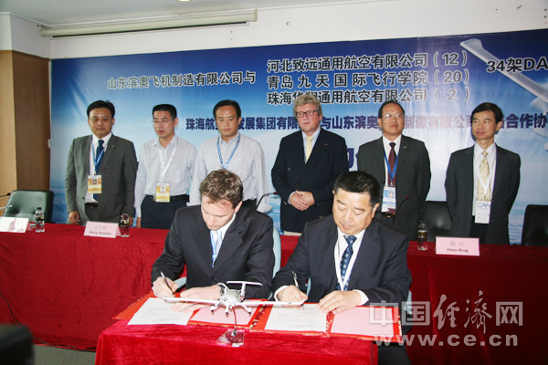 中國(guó)經(jīng)濟(jì)網(wǎng)珠海航展特派記者團(tuán) 記者王飛 11月16日?qǐng)?bào)道 15日,山東濱奧飛機(jī)制造有限公司在珠海航展上分別與河北致遠(yuǎn)通用航空有限公司、青島九天國(guó)際飛行學(xué)院、珠海華翔通用航空有限公司簽署總共銷(xiāo)售34架DA40飛機(jī)購(gòu)機(jī)合同定單,并同時(shí)與珠海航空城簽署戰(zhàn)略合作協(xié)議。