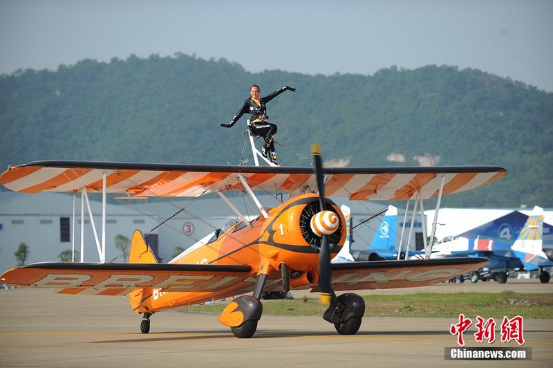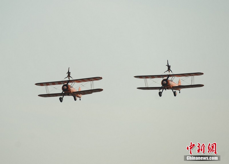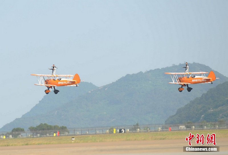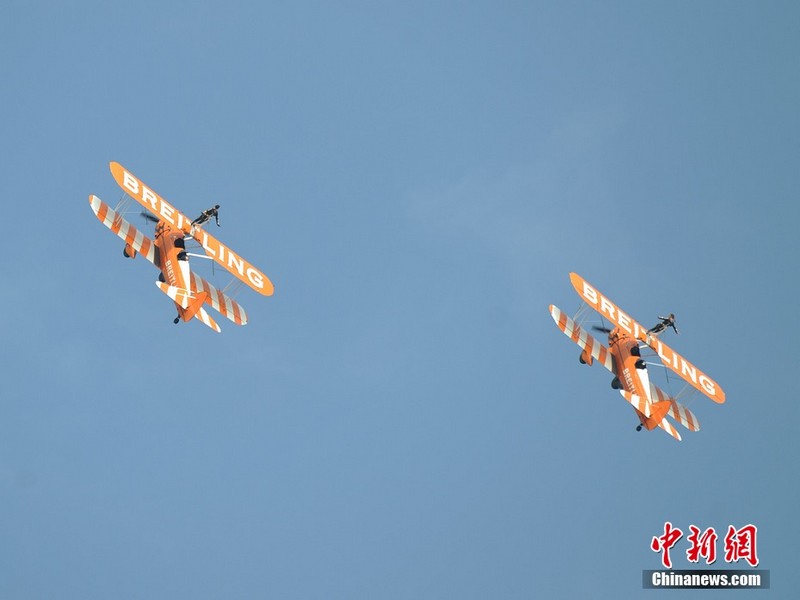 11月11日下午,歐洲“百年靈”機(jī)翼行走飛行表演隊(duì)表演了精彩的“云中漫步”。兩架飛機(jī)上各站有一名美女,在空中表演獨(dú)門(mén)舞步和雜技,隨飛機(jī)一起“云中漫步”,優(yōu)雅精準(zhǔn)!
