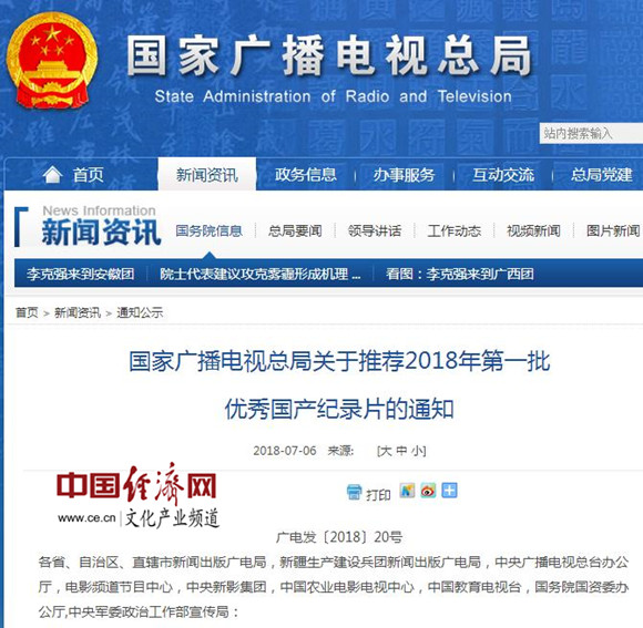 國家廣播電視總局關(guān)于推薦2018年第一批優(yōu)秀國產(chǎn)紀錄片的通知