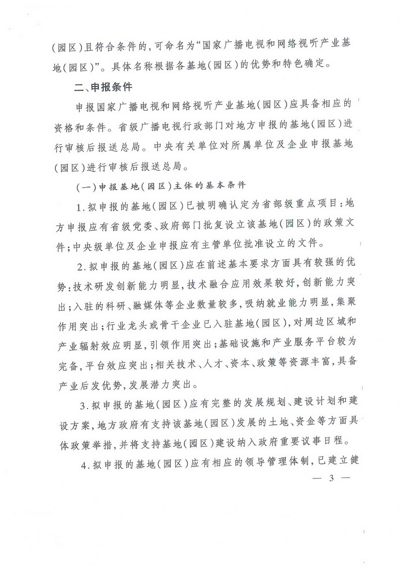 申報國家廣播電視和網(wǎng)絡(luò)視聽產(chǎn)業(yè)基地(園區(qū))應(yīng)具備相應(yīng)的資格和條件。省級廣播電視行政部門對地方申報的基地(園區(qū))進行審核后報送總局。中央有關(guān)單位對所屬單位及企業(yè)申報基地(園區(qū))進行審核后報送總局。