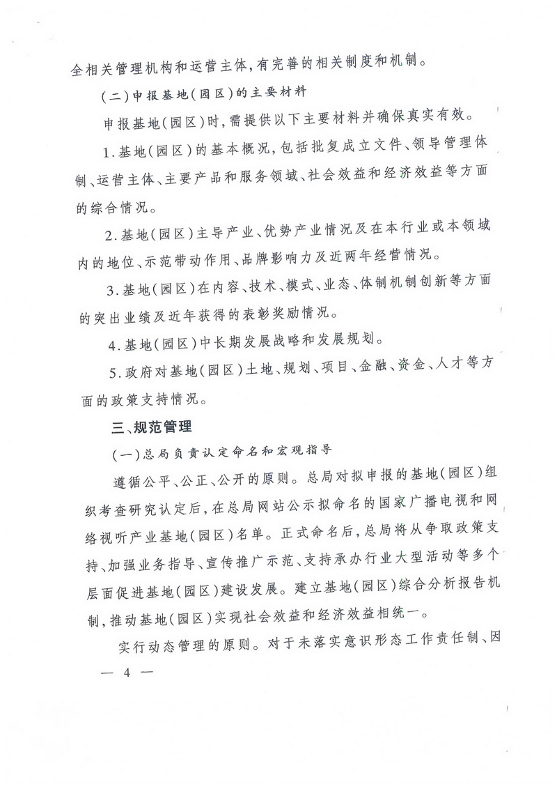 對總局此前已經(jīng)命名的基地(園區(qū)),屬于廣播電視和網(wǎng)絡(luò)視聽方面的,要進行全面梳理,按本通知精神納入統(tǒng)籌管理,推動轉(zhuǎn)型升級,并按上述時間要求報送年度發(fā)展情況報告。