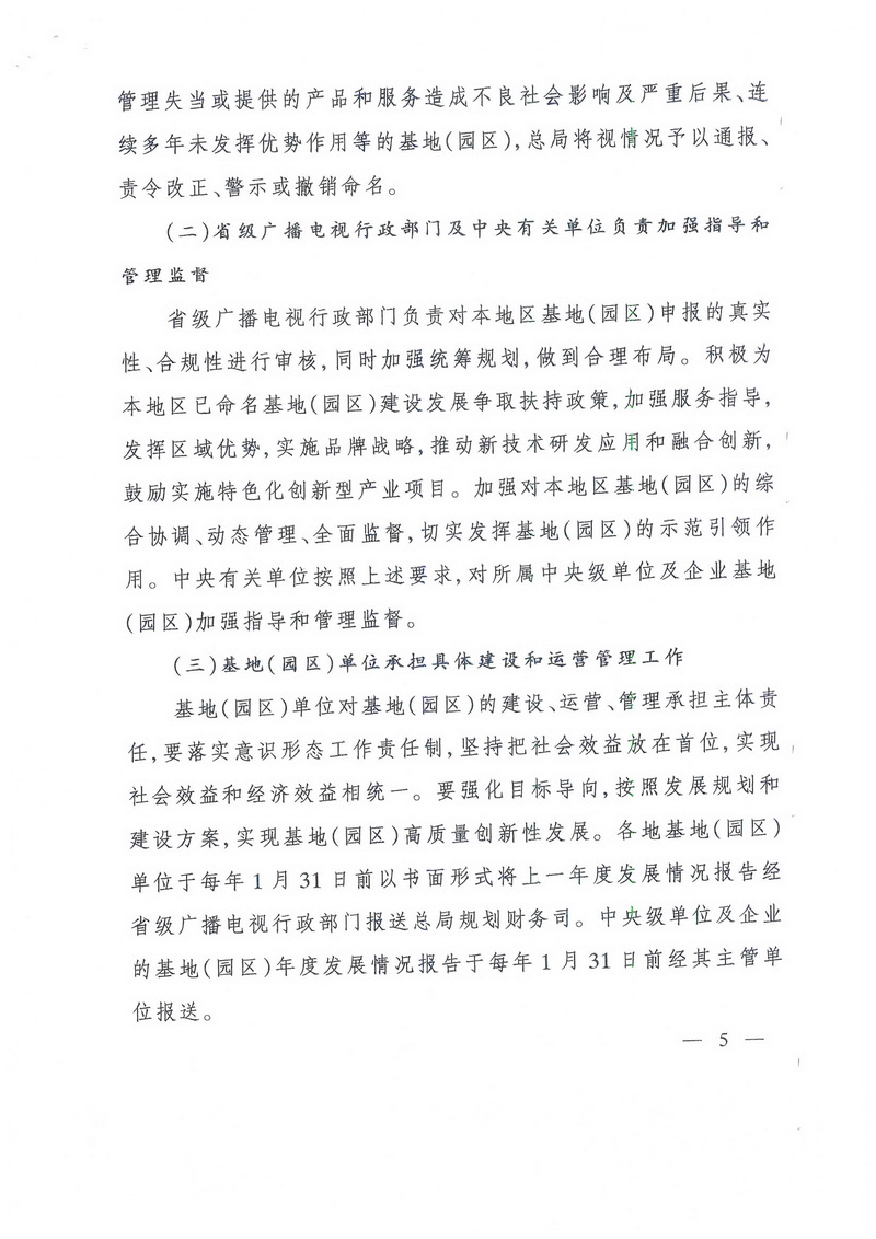 省級廣播電視行政部門負(fù)責(zé)對本地區(qū)基地(園區(qū))申報的真實性、合規(guī)性進行審核,同時加強統(tǒng)籌規(guī)劃,做到合理布局。積極為本地區(qū)已命名基地(園區(qū))建設(shè)發(fā)展?fàn)幦》龀终?,加強服?wù)指導(dǎo),發(fā)揮區(qū)域優(yōu)勢,實施品牌戰(zhàn)略,推動新技術(shù)研發(fā)應(yīng)用和融合創(chuàng)新,鼓勵實施特色化創(chuàng)新型產(chǎn)業(yè)項目。加強對本地區(qū)基地(園區(qū))的綜合協(xié)調(diào)、動態(tài)管理、全面監(jiān)督,切實發(fā)揮基地(園區(qū))的示范引領(lǐng)作用。中央有關(guān)單位按照上述要求,對所屬中央級單位及企業(yè)基地(園區(qū))加強指導(dǎo)和管理監(jiān)督。