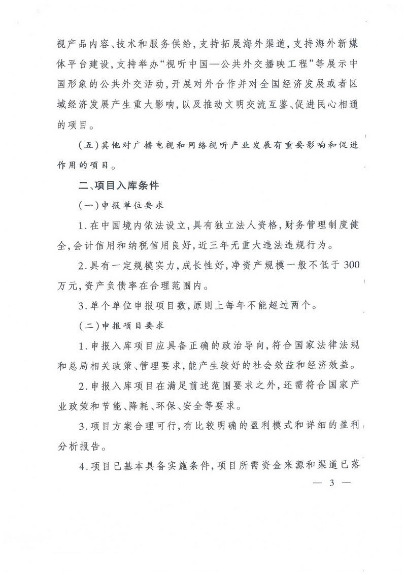 為充分發(fā)揮廣播電視和網(wǎng)絡(luò)視聽產(chǎn)業(yè)項(xiàng)目支撐作用,為發(fā)展規(guī)劃做好儲(chǔ)備,總局?jǐn)M建立廣播電視和網(wǎng)絡(luò)視聽產(chǎn)業(yè)發(fā)展項(xiàng)目庫,培育扶持符合行業(yè)高質(zhì)量創(chuàng)新性發(fā)展方向的廣播電視和網(wǎng)絡(luò)視聽產(chǎn)業(yè)重點(diǎn)項(xiàng)目。現(xiàn)將有關(guān)事項(xiàng)通知如下: