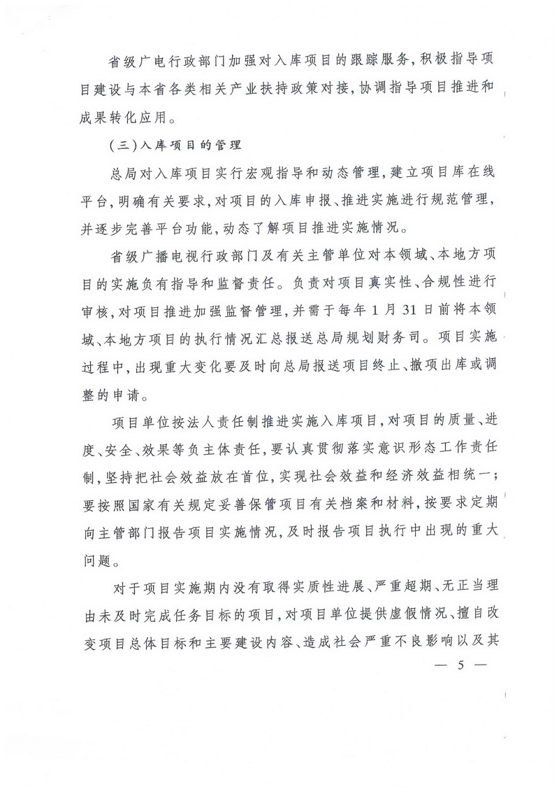 省級(jí)廣播電視行政部門及有關(guān)主管單位對(duì)本領(lǐng)域、本地方項(xiàng)目的實(shí)施負(fù)有指導(dǎo)和監(jiān)督責(zé)任。負(fù)責(zé)對(duì)項(xiàng)目真實(shí)性、合規(guī)性進(jìn)行審核,對(duì)項(xiàng)目推進(jìn)加強(qiáng)監(jiān)督管理,并需于每年1月31日前將本領(lǐng)域、本地方項(xiàng)目的執(zhí)行情況匯總報(bào)送總局規(guī)劃財(cái)務(wù)司。項(xiàng)目實(shí)施過程中,出現(xiàn)重大變化要及時(shí)向總局報(bào)送項(xiàng)目終止、撤項(xiàng)出庫或調(diào)整的申請(qǐng)。