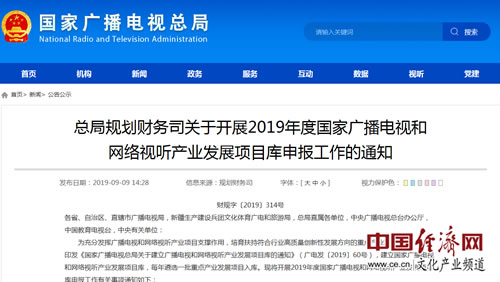 經(jīng)濟(jì)日?qǐng)?bào)-中國(guó)經(jīng)濟(jì)網(wǎng)北京9月10日訊 日前,國(guó)家廣播電視總局發(fā)布了關(guān)于開(kāi)展2019年度國(guó)家廣播電視和網(wǎng)絡(luò)視聽(tīng)產(chǎn)業(yè)發(fā)展項(xiàng)目庫(kù)申報(bào)工作的通知。通知表明,為充分發(fā)揮廣播電視和網(wǎng)絡(luò)視聽(tīng)產(chǎn)業(yè)項(xiàng)目支撐作用,培育扶持符合行業(yè)高質(zhì)量創(chuàng)新性發(fā)展方向的重點(diǎn)產(chǎn)業(yè)發(fā)展項(xiàng)目,國(guó)家廣播電視總局印發(fā)《國(guó)家廣播電視總局關(guān)于建立廣播電視和網(wǎng)絡(luò)視聽(tīng)產(chǎn)業(yè)發(fā)展項(xiàng)目庫(kù)的通知》(廣電發(fā)〔2019〕60號(hào)),建立國(guó)家廣播電視和網(wǎng)絡(luò)視聽(tīng)產(chǎn)業(yè)發(fā)展項(xiàng)目庫(kù),每年遴選一批重點(diǎn)產(chǎn)業(yè)發(fā)展項(xiàng)目入庫(kù)。