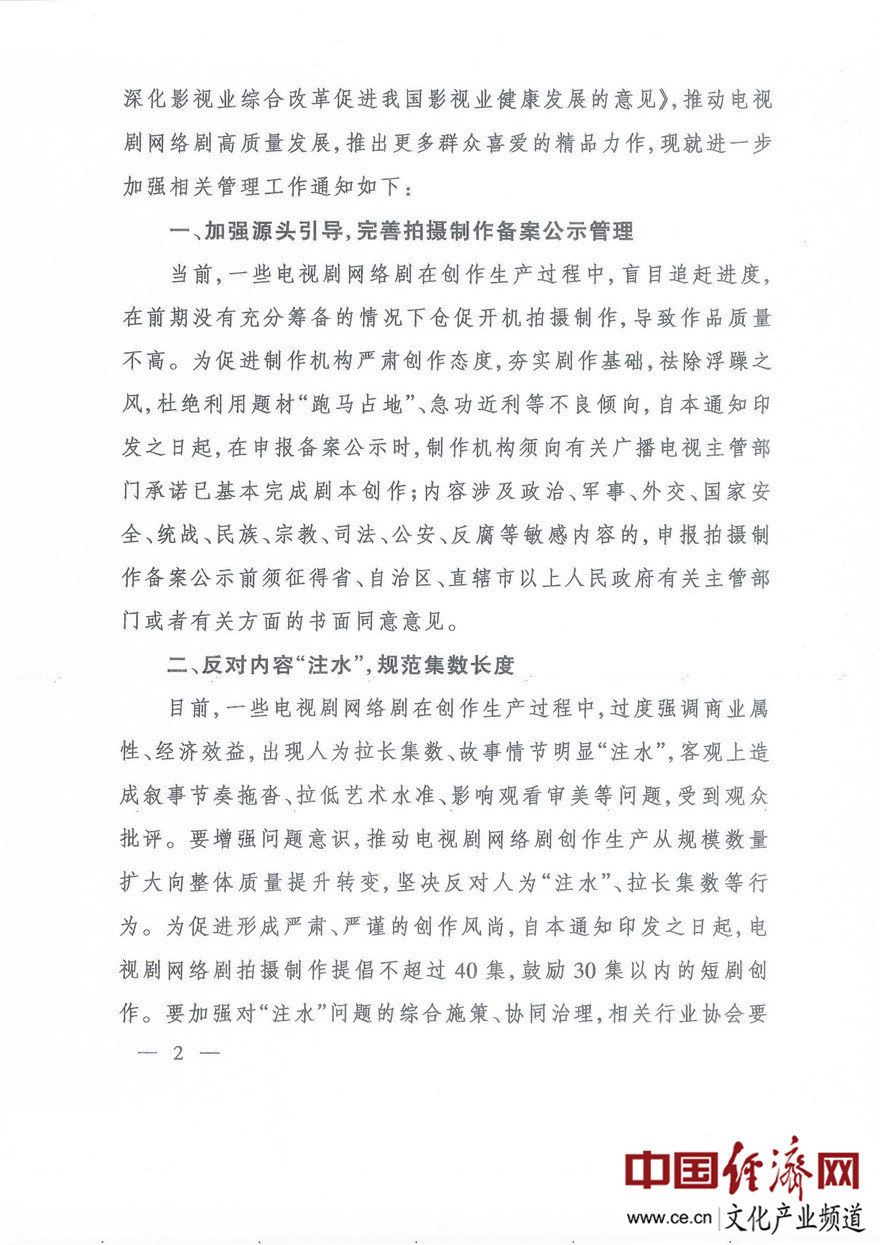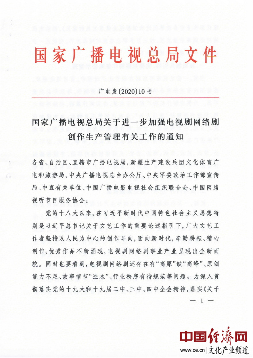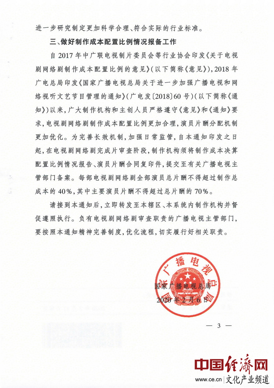 經(jīng)濟日報-中國經(jīng)濟網(wǎng)北京2月20日訊 近日,國家廣播電視總局下發(fā)了《進一步加強電視劇網(wǎng)絡(luò)劇創(chuàng)作生產(chǎn)管理有關(guān)工作的通知》(廣電發(fā)﹝2020﹞10號)。據(jù)經(jīng)濟日報-中國經(jīng)濟網(wǎng)文化產(chǎn)業(yè)頻道(微信號:cewenhua)了解,該《通知》要求:一是加強源頭引導(dǎo),在申報備案公示時,制作機構(gòu)須向省局承諾已基本完成劇本創(chuàng)作;二是反對內(nèi)容“注水”,電視劇網(wǎng)絡(luò)劇拍攝制作提倡不超過40集,鼓勵30集以內(nèi)短劇創(chuàng)作;三是做好制作成本配置比例情況報備工作。在電視劇網(wǎng)絡(luò)劇完成片審查階段,制作機構(gòu)須將制作成本決算配置比例情況報告、演員片酬合同復(fù)印件,提交至省局備案。每部電視劇網(wǎng)絡(luò)劇全部演員總片酬不得超過制作總成本的40%,其中主要演員片酬不得超過總片酬的70%。>>>更多政策可查看中國經(jīng)濟網(wǎng)“中國文化產(chǎn)業(yè)政策庫”