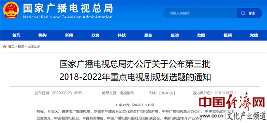 經(jīng)濟(jì)日報(bào)-中國經(jīng)濟(jì)網(wǎng)北京6月24日訊 近日,國家廣播電視總局辦公廳發(fā)布了《國家廣播電視總局辦公廳關(guān)于公布第三批2018-2022年重點(diǎn)電視劇規(guī)劃選題的通知》(以下簡稱“通知”),通知公布了2018-2022年重點(diǎn)電視劇規(guī)劃選題,共計(jì)100部?!豆住贰堕}寧鎮(zhèn)》《大國擔(dān)當(dāng)》等作品確定為此次重點(diǎn)電視劇規(guī)劃選題。