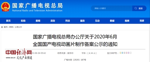 經(jīng)濟日報-中國經(jīng)濟網(wǎng)北京8月5日訊 中國經(jīng)濟網(wǎng)文化產(chǎn)業(yè)頻道記者從國家廣播電視總局官網(wǎng)獲悉,《國家廣播電視總局辦公廳關(guān)于2020年6月全國國產(chǎn)電視動畫片制作備案公示的通知》(簡稱《通知》)于4日發(fā)布。《通知》明確,2020年6月,經(jīng)備案公示的全國國產(chǎn)電視動畫片為53部,19934分鐘。