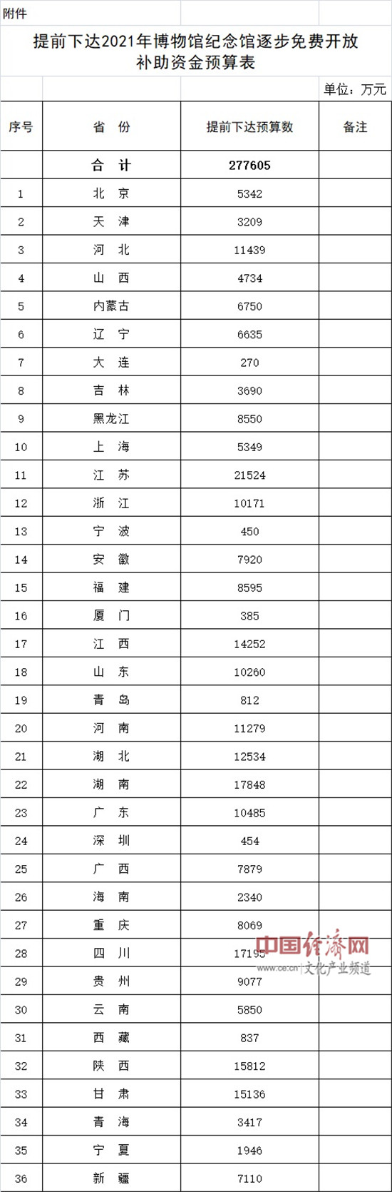以下為提前下達(dá)2021年博物館紀(jì)念館逐步免費(fèi)開(kāi)放補(bǔ)助資金預(yù)算表:
