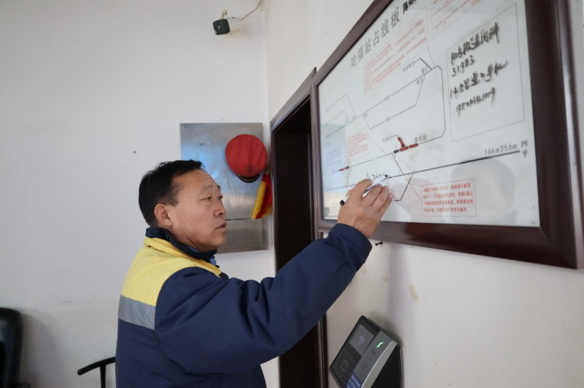 9時(shí)10分,正在站長(zhǎng)室認(rèn)真填寫《站務(wù)日志》的副站長(zhǎng)汪曉利,接到車站值班員“43078次列車開過來了,站序防護(hù)”的電話通知,他摘下老花鏡,起身穿上棉大衣,戴好帽子,出門向400米外的站序防護(hù)地點(diǎn)走去?!靶≌镜母刹烤鸵恰f金油’,哪個(gè)崗位缺人,我們老哥倆都要頂上。夏季每天站序防護(hù)需要往返20多次,即使冬季能少點(diǎn),也要10幾次?!迸D月的寒風(fēng)中,汪曉利一邊走一邊說。
