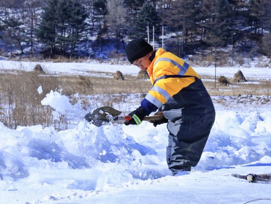 “注意寬度和深度,把握好尺寸!”現(xiàn)場負(fù)責(zé)人羅軍一邊測量冰槽尺寸,一邊提醒作業(yè)人員。使用油鋸開鑿導(dǎo)流水道時(shí),寬度必須精準(zhǔn):過窄則排水不暢,過寬則水流速緩,易重新凍結(jié)。每次作業(yè),羅軍都會(huì)嚴(yán)格把關(guān),確保導(dǎo)流槽既有效又持久。