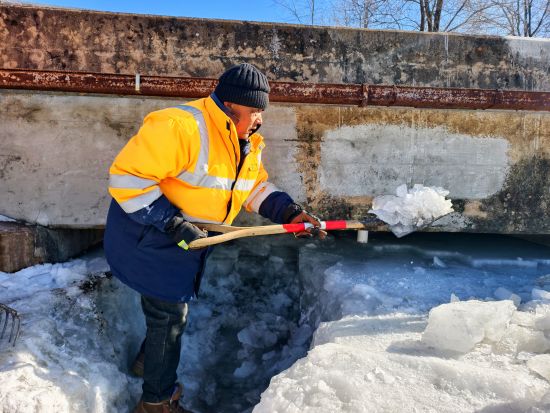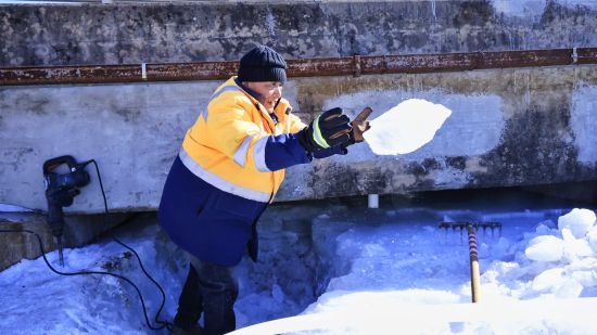 作業(yè)人員使用鐵鍬將冰塊從橋下鏟出。