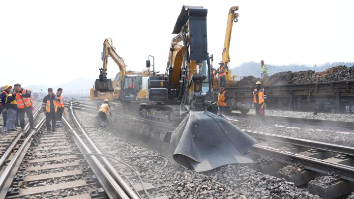 11時20分,隨著施工命令下達,道岔清篩機率先啟動,巨大的挖掘鏈精準探入道岔關(guān)鍵區(qū)域,在現(xiàn)場作業(yè)人員的配合下,將臟污的道砟挖出并輸送至線路一側(cè),再由帶篩網(wǎng)的鉤機將清理出的泥土廢砟清運到軌道車的平板上。
