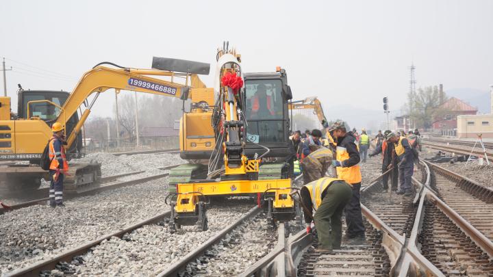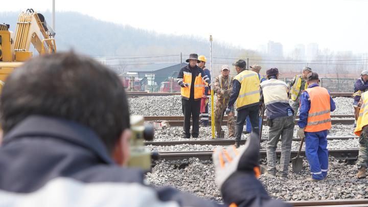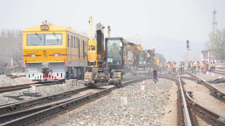 4月14日11時10分,在沈丹上行線石橋子站內(nèi)22號道岔旁人頭攢動,機械轟鳴,循聲望去,一臺道岔清篩鉤機、一臺搗固鉤機以及三臺配備精細篩網(wǎng)的鉤機已按預定方案就位,與此同時,來自丹東工務段石橋子線路車間70余名干部職工身著黃色工作服,手拿撬棍、鐵鍬,在線路兩旁排隊等候施工命令的下達,一場以機械為主力、人工作業(yè)精準配合的道岔機械清篩施工即將有序展開。