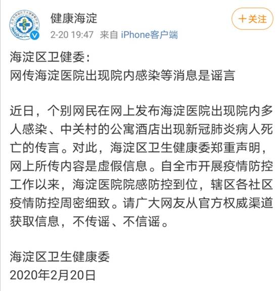 經(jīng)濟(jì)日?qǐng)?bào)-中國(guó)經(jīng)濟(jì)網(wǎng)2月21日訊 (記者朱國(guó)旺 郭文培) 近日,個(gè)別網(wǎng)民在網(wǎng)上發(fā)布海淀醫(yī)院出現(xiàn)院內(nèi)多人感染、中關(guān)村的公寓酒店出現(xiàn)新冠肺炎病人死亡的傳言。
