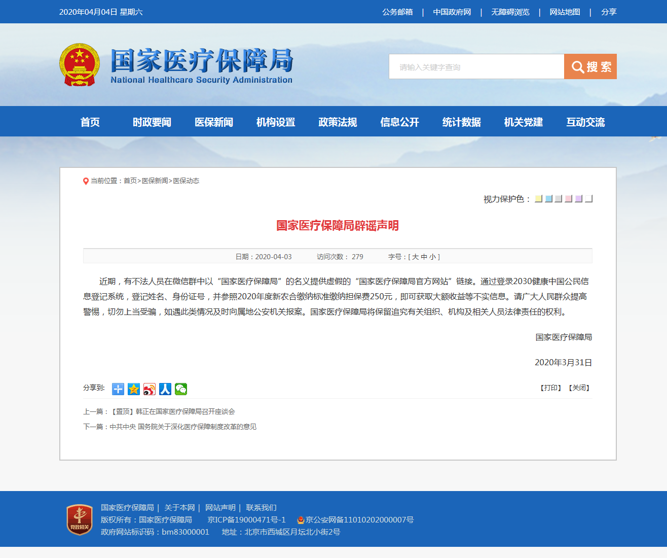 4月3日,國家醫(yī)療保障局發(fā)布辟謠聲明:請廣大人民群眾提高警惕,切勿上當(dāng)受騙,如遇此類情況及時向?qū)俚毓矙C關(guān)報案。國家醫(yī)療保障局將保留追究有關(guān)組織、機構(gòu)及相關(guān)人員法律責(zé)任的權(quán)利。