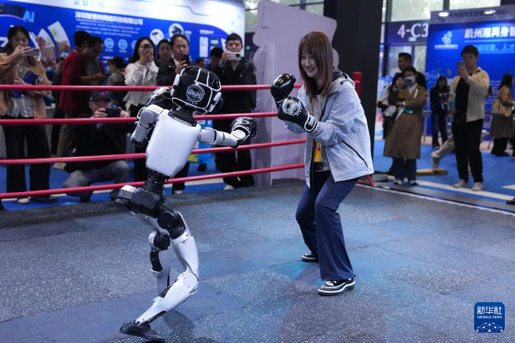 11月6日,觀眾在2025年世界互聯(lián)網(wǎng)大會“互聯(lián)網(wǎng)之光”博覽會現(xiàn)場體驗與宇樹科技G1機(jī)器人“格斗”。新華社記者 黃宗治 攝