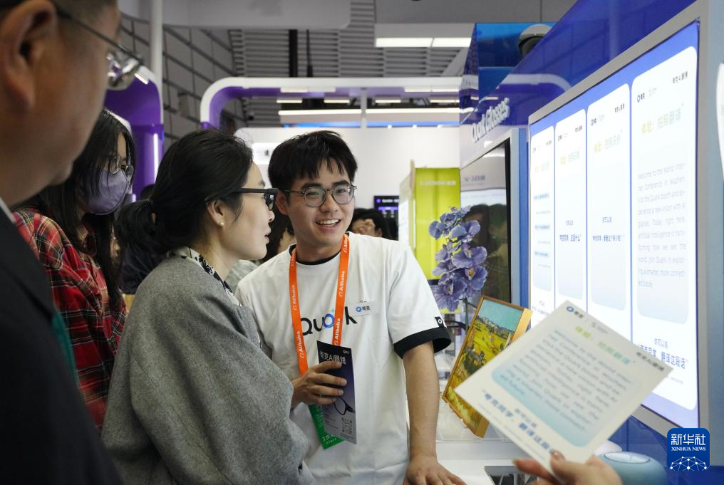 11月6日,觀眾在2025年世界互聯(lián)網(wǎng)大會“互聯(lián)網(wǎng)之光”博覽會現(xiàn)場的AI眼鏡展臺試戴AI眼鏡。新華社記者 劉瓊 攝