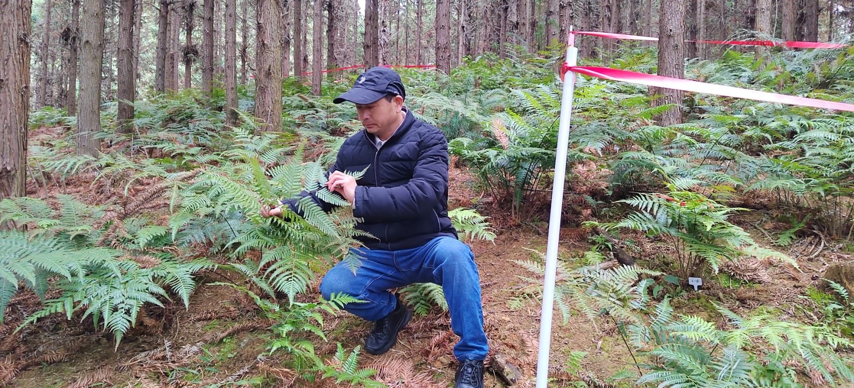圖為陳幸良在廣西融水觀察林下金毛狗脊生長情況。(受訪者供圖)
