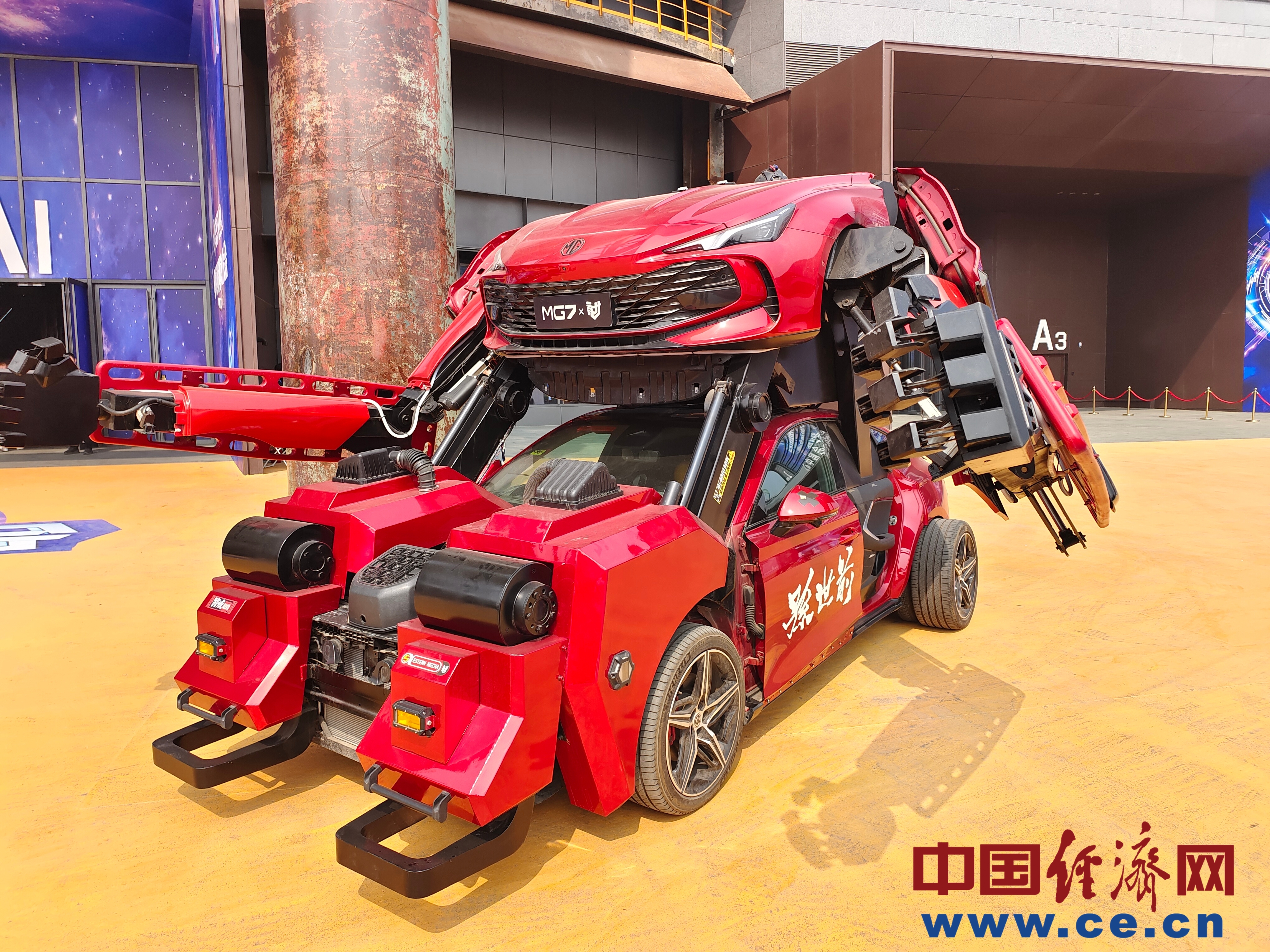 MECHASUN格斗汽車機(jī)甲,由孫世前帶領(lǐng)團(tuán)隊(duì)研發(fā)制作,該系列機(jī)甲采用了團(tuán)隊(duì)自主研發(fā)的專利架構(gòu)。中國經(jīng)濟(jì)網(wǎng)記者 朱曉倩/攝