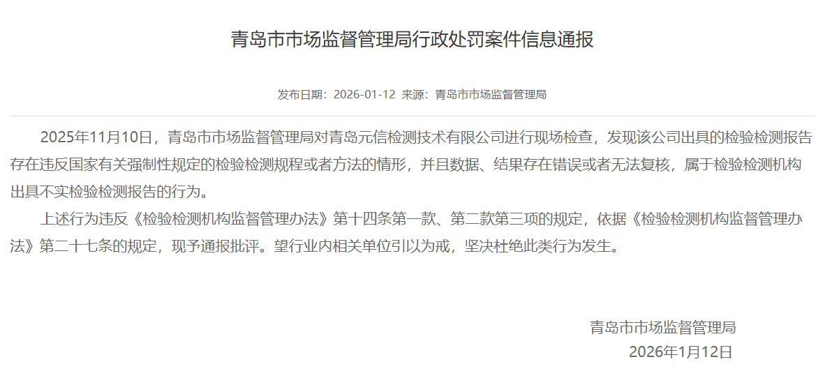 這場圍繞雞蛋角黃素的爭議,最早在今年“3?15”前后引發(fā)廣泛關(guān)注。某打假人連續(xù)發(fā)布檢測報告,稱在商超渠道購買的多款雞蛋中檢出角黃素,并點名黃天鵝等品牌,正式拉開事件序幕。隨著官方抽檢結(jié)果公布,個人送檢“檢出角黃素”與官方抽檢“未檢出角黃素”兩種結(jié)論并存,相關(guān)討論也從食品安全本身,進一步延伸至檢測報告的公信力之爭。其中,為某打假人提供檢測報告的檢測機構(gòu)合規(guī)性備受質(zhì)疑:據(jù)青島市市場監(jiān)管局公開信息,青島元信檢測技術(shù)有限公司因“出具不實檢驗檢測報告”“數(shù)據(jù)無法復核”等問題,已于2026年1月12日被行政處罰。