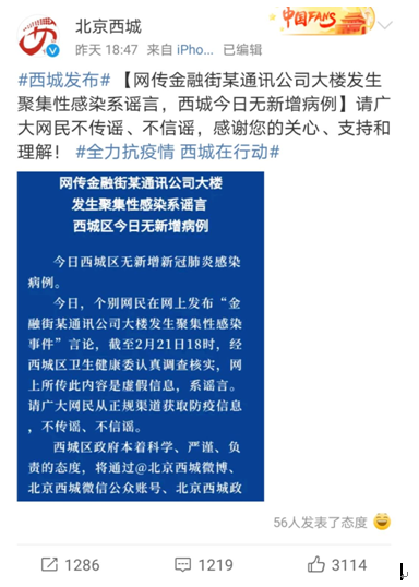 截至2月21日18時,經(jīng)西城區(qū)衛(wèi)生健康委認(rèn)真調(diào)查核實,網(wǎng)上“金融街某通訊公司大樓發(fā)生聚集性感染”是虛假信息,系謠言。請廣大網(wǎng)民從正規(guī)渠道獲取防疫信息。