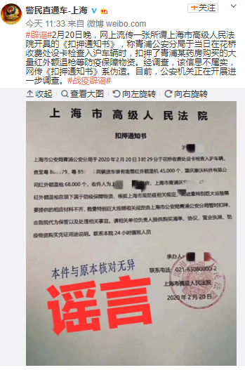 經(jīng)濟(jì)日?qǐng)?bào)-中國(guó)經(jīng)濟(jì)網(wǎng)2月22日訊 (記者 朱國(guó)旺 郭文培) 2月20日晚,網(wǎng)上流傳一張所謂上海市高級(jí)人民法院開(kāi)具的《扣押通知書(shū)》,稱青浦公安分局于當(dāng)日(20日)在花橋收費(fèi)處設(shè)卡檢查入滬車輛時(shí),扣押了青浦某藥房購(gòu)買(mǎi)的大量紅外額溫槍等防疫保障物資。