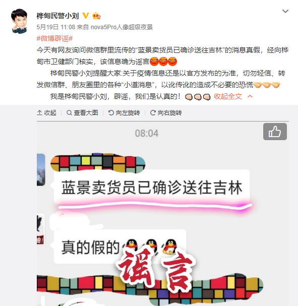 據(jù)吉林省樺甸市公安局永吉派出所民警劉剛 @樺甸民警小劉 5月19日消息,經(jīng)向樺甸市衛(wèi)健部門(mén)核實(shí),網(wǎng)傳“藍(lán)景賣(mài)貨員已確診送往吉林”系謠言。