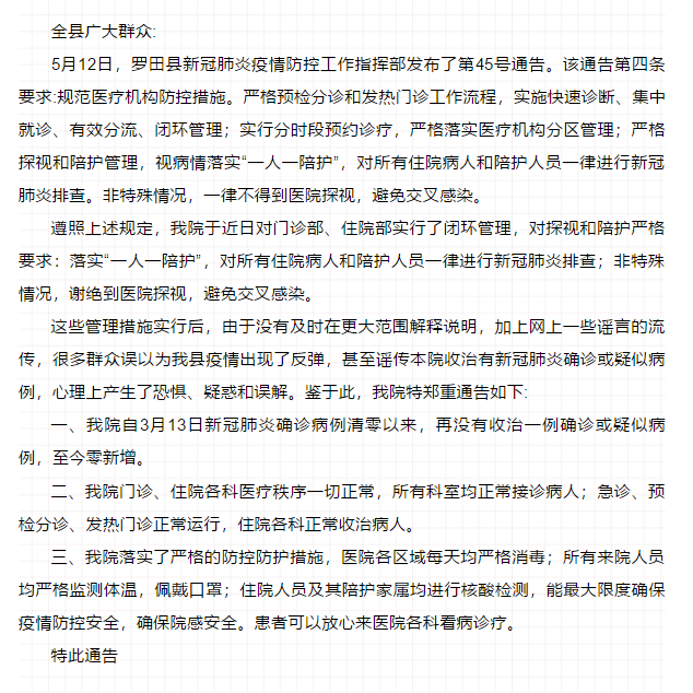 針對(duì)近日湖北羅田縣人民醫(yī)院收治新冠肺炎確診病例等傳言,5月22日,羅田縣人民醫(yī)院發(fā)布《關(guān)于本院疫情防控和醫(yī)療秩序一切正常的通告》辟謠稱,該院自3月13日新冠肺炎確診病例清零以來,再?zèng)]有收治一例確診或疑似病例,至今零新增。目前,該院門診、住院各科醫(yī)療秩序一切正常,所有科室均正常接診病人;急診、預(yù)檢分診、發(fā)熱門診正常運(yùn)行,住院各科正常收治病人。