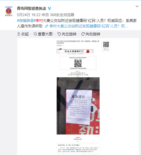 據(jù)半島都市報(bào)官微5月24日?qǐng)?bào)道,針對(duì)“發(fā)現(xiàn)一名健康通行碼紅碼人員”一事,經(jīng)落實(shí),系其家人操作失誤所致,該名人員實(shí)際持有綠碼,無健康問題。此外,5月24日,山東省青島市公安局網(wǎng)絡(luò)警察支隊(duì)官方微博也對(duì)此傳言進(jìn)行了辟謠。