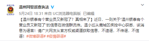 據(jù)@溫州網(wǎng)警巡查執(zhí)法5月24日消息,從鹿城區(qū)疾控中心獲悉,網(wǎng)傳“溫州銀泰有營業(yè)員感染新冠病毒”系謠言。請(qǐng)廣大網(wǎng)友從官方權(quán)威渠道獲取信息,不造謠,不傳謠,不信謠。